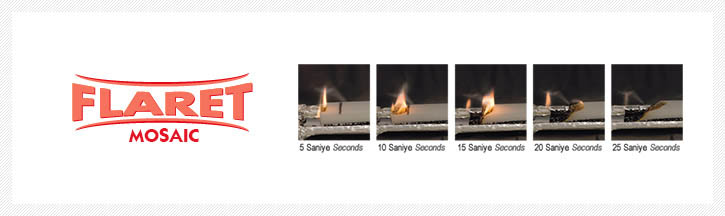 Flaret Mosaic süngerler, İngiltere (BS 5852, BS 7177), Avrupa (MVSS-302, ISO-3795), ve Amerika standartlarına uygun olarak üretilmekte ve uluslararası akreditasyona sahip laboratuarlar tarafından yanmazlık testleri yapılarak sertifikalandırılmaktadır.